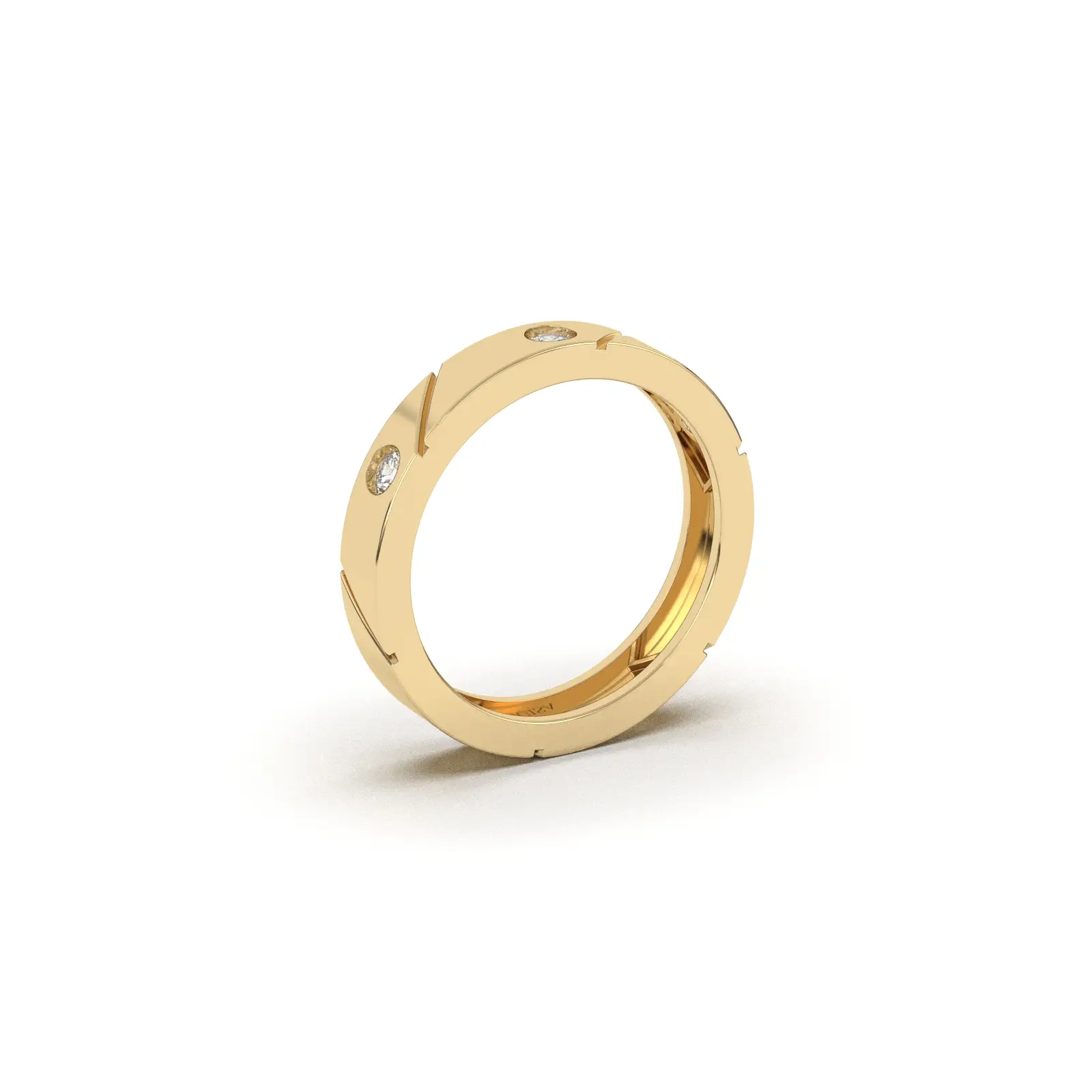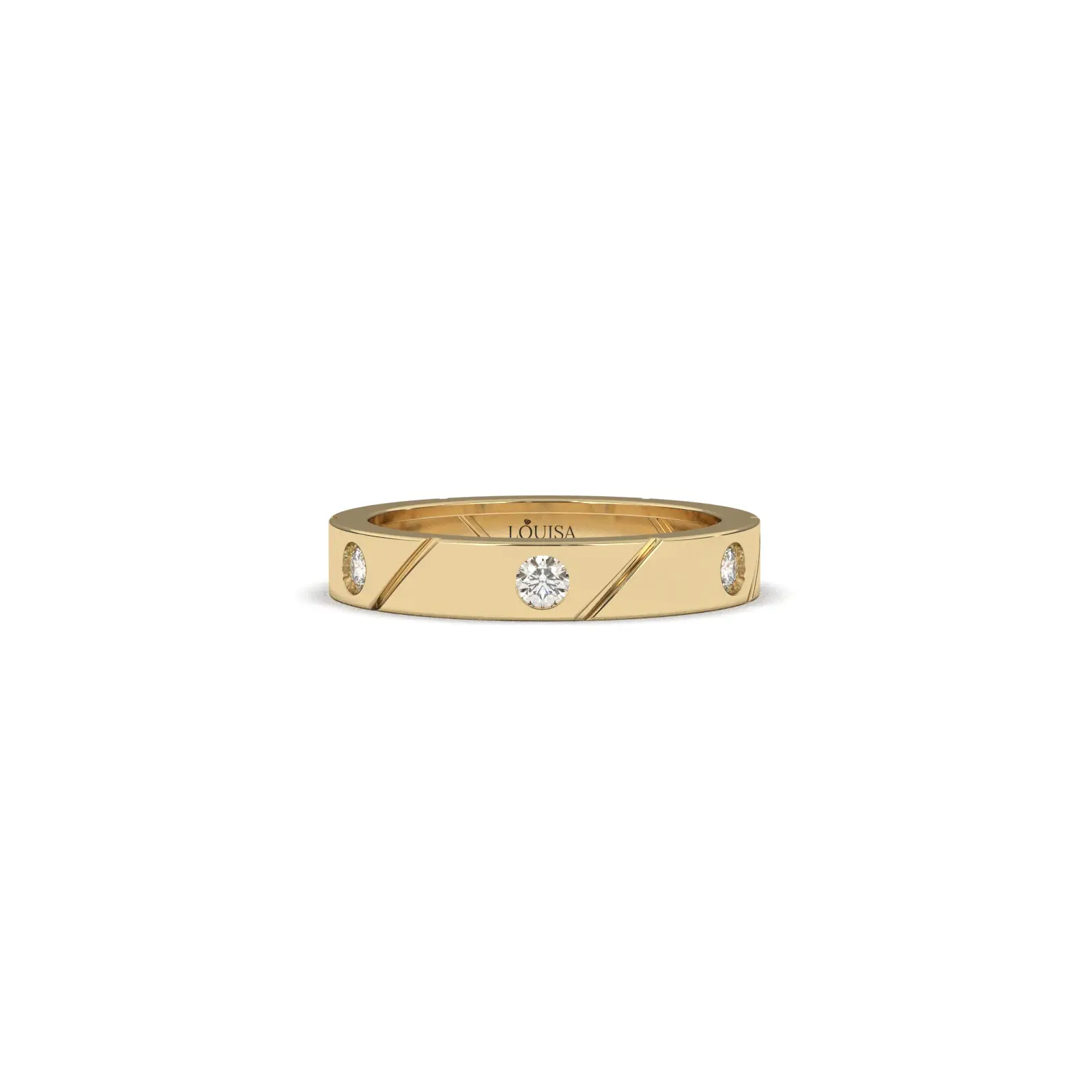 פס הזהב העבה והחלק משדר יציבות ועוצמה, בעוד ש-6 היהלומים המשובצים במרחקים שווים לאורך הטבעת מוסיפים ניצוץ אלגנטי שאינו משתלט, אלא משלים את המראה.