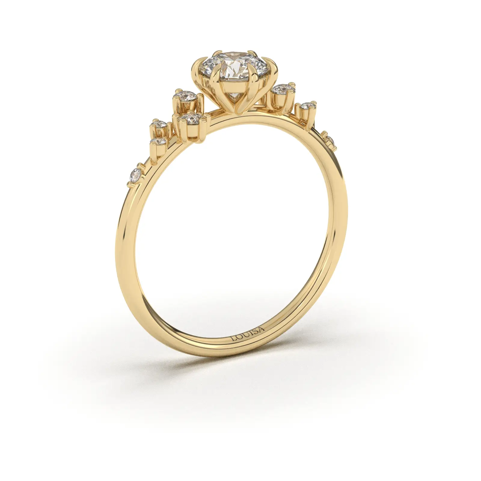 אך הקסם האמיתי מתרחש בצידיו: במקום שורת יהלומים ישרה ורגילה על גבי החישוק, יצרנו דירוג אמנותי של 5 יהלומים נוספים מכל צד (סה"כ 11 יהלומים בטבעת).