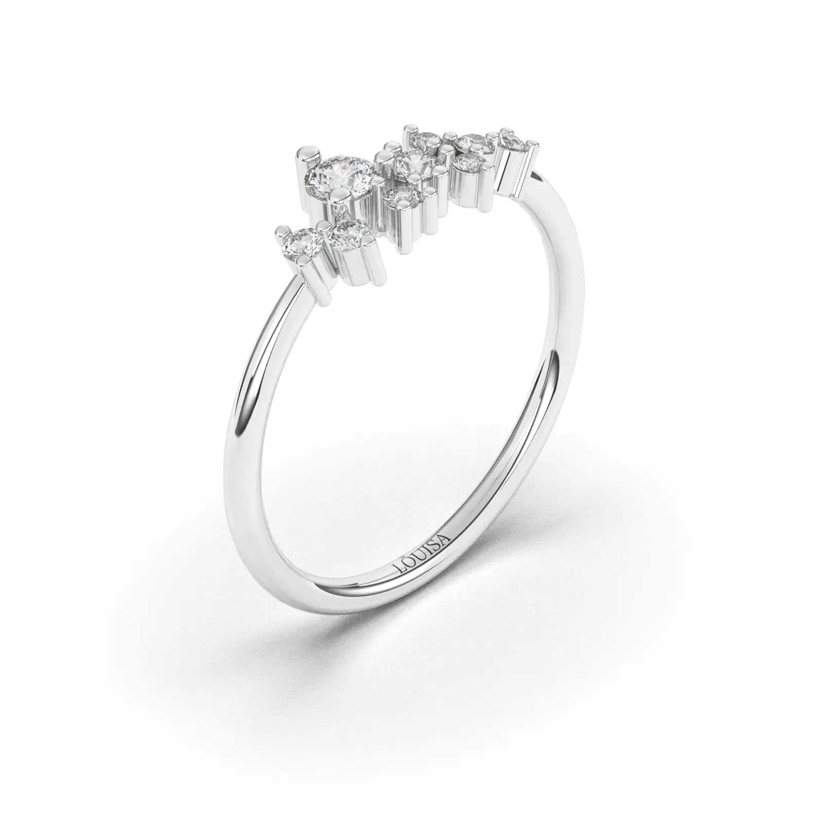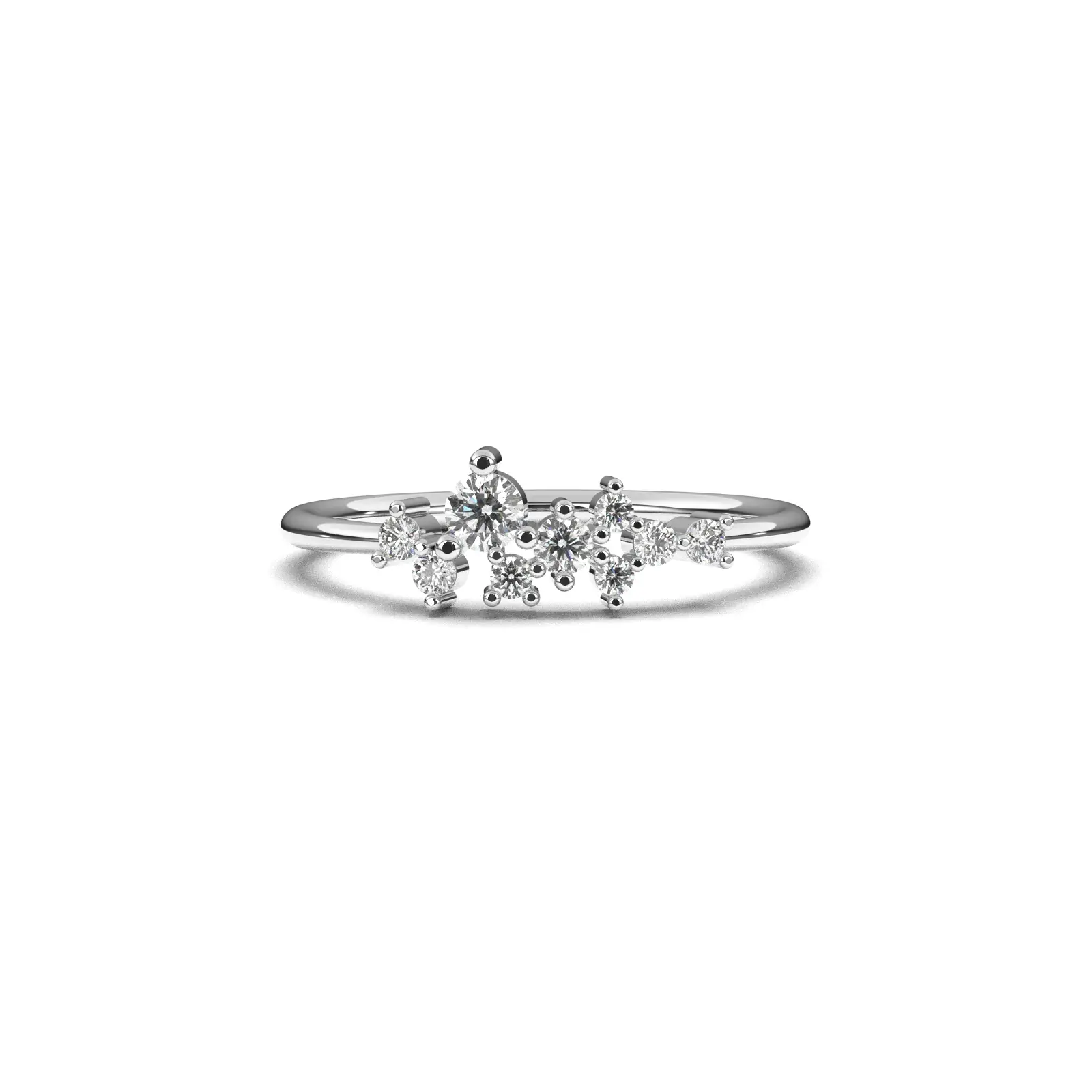במקום התמקדות ביהלום מרכזי אחד, יצרנו כאן קומפוזיציה מרהיבה של 9 יהלומים עגולים בגדלים שונים, המשובצים בטכניקה מדורגת המעניקה תחושה של תנועה וניצוץ אינסופי.