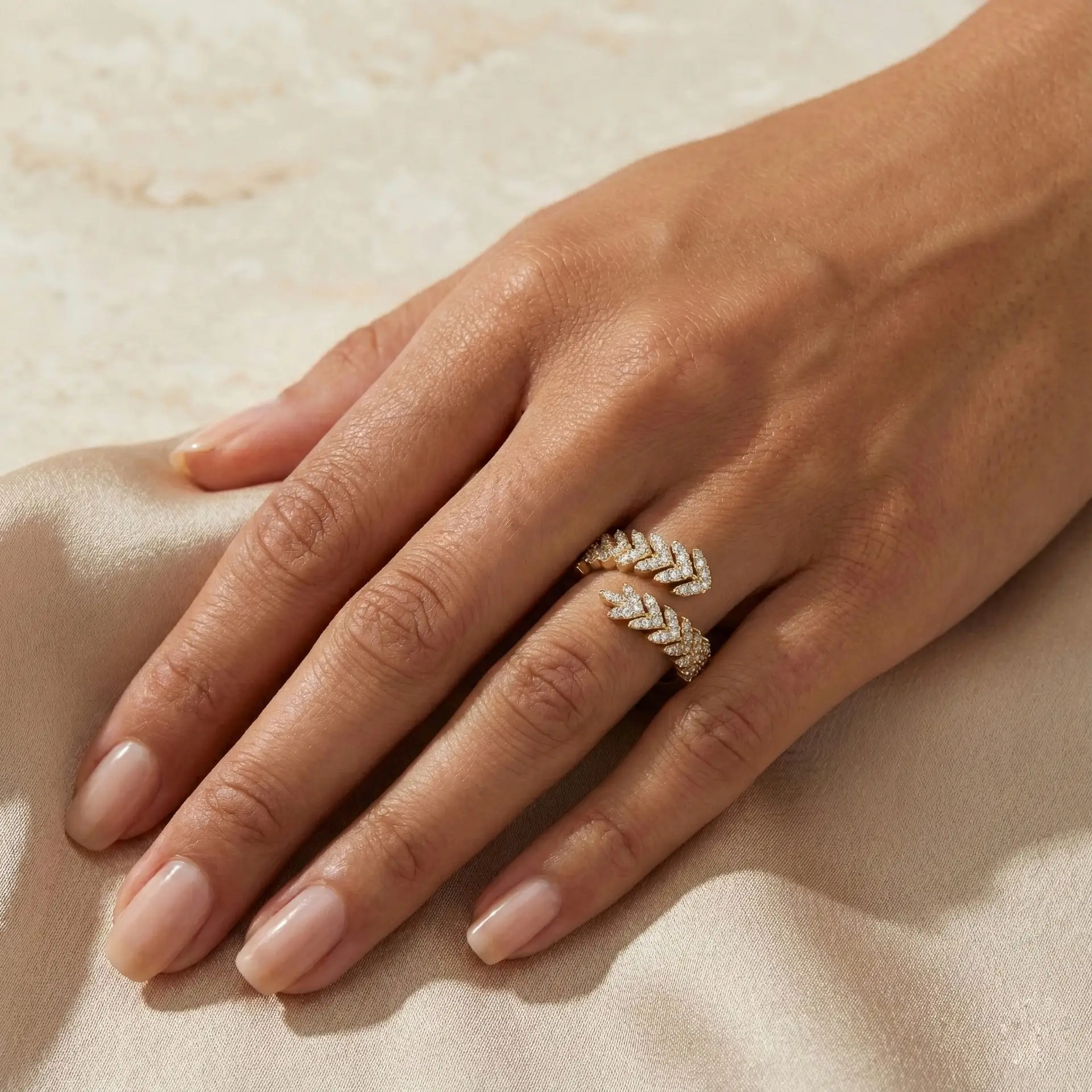 טבעת עלי זהב מגדירה מחדש עיצוב נשי יוקרתי בהשראת הטבע.