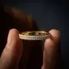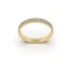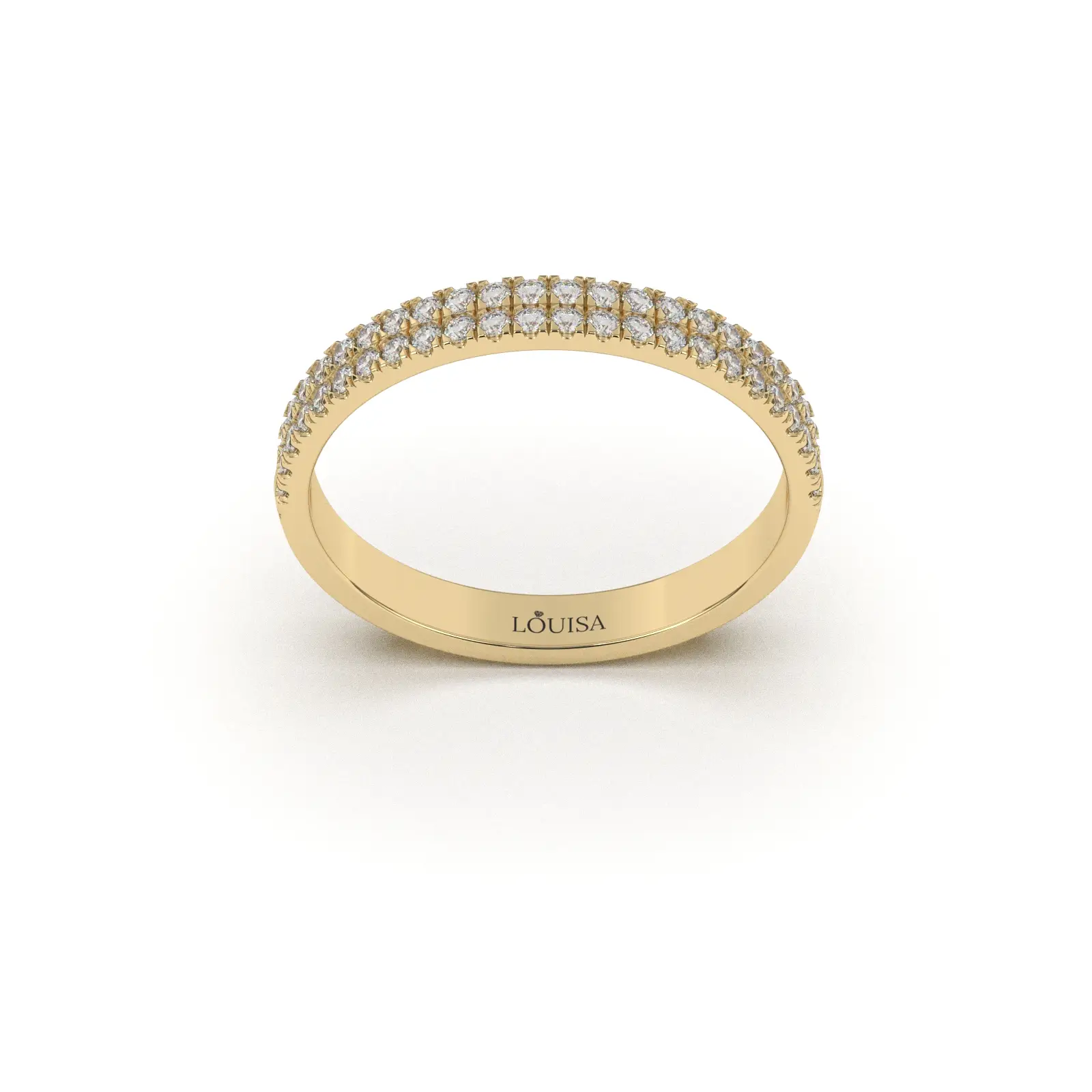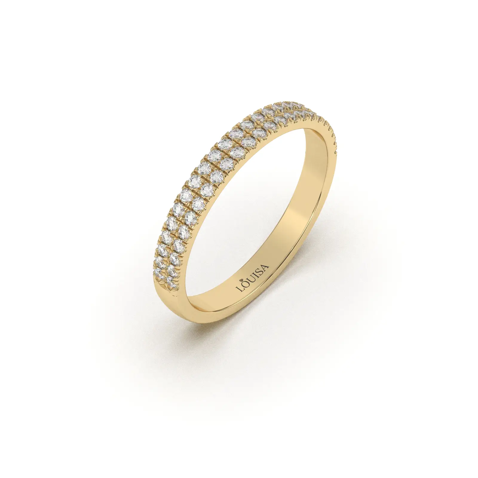 הטבעת זהב 14 קראט ומעוטרת בשתי שורות צפופות של יהלומים נוצצים.