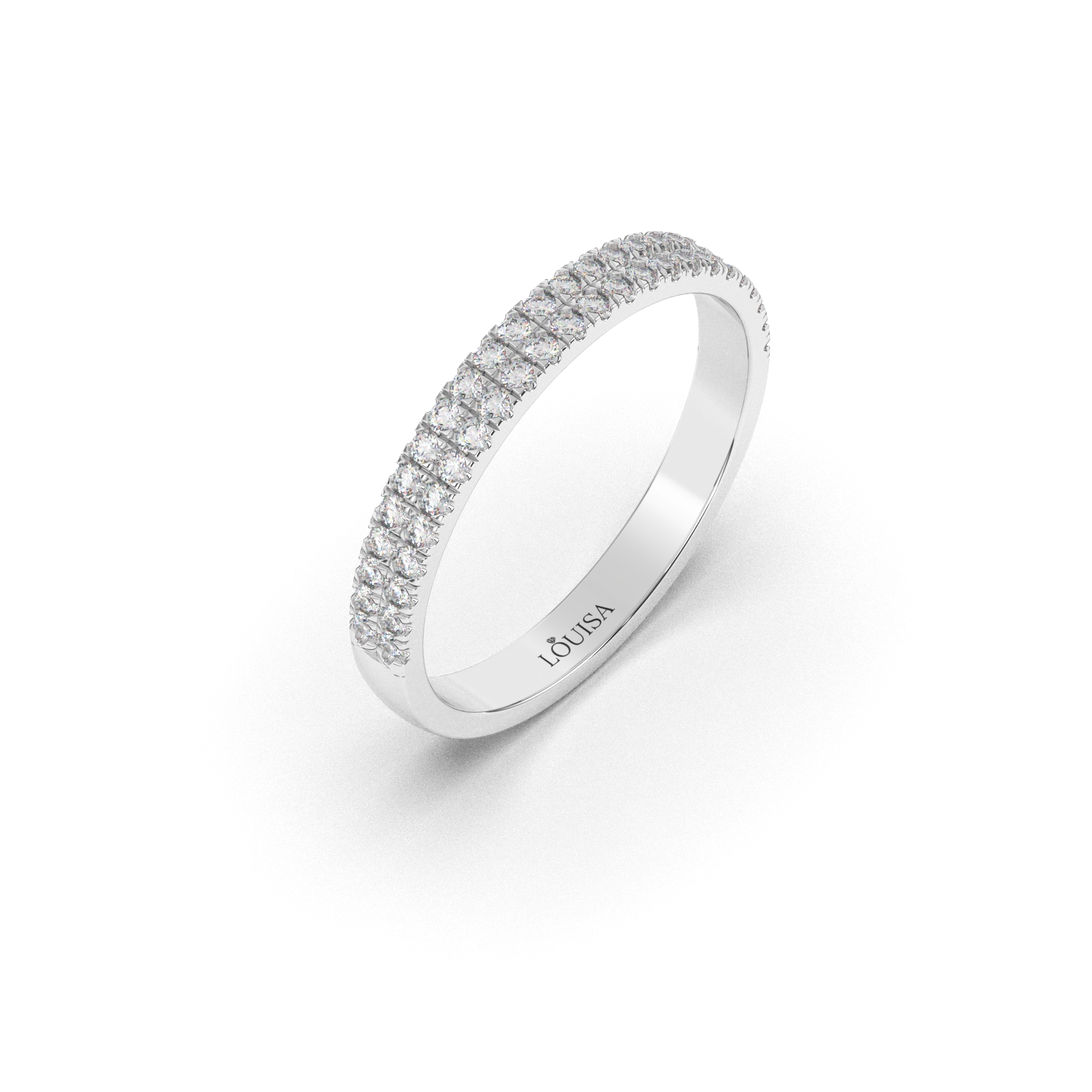 הטבעת עשויה זהב 14 קראט ומעוטרת בשתי שורות צפופות של יהלומים נוצצים.