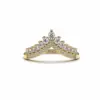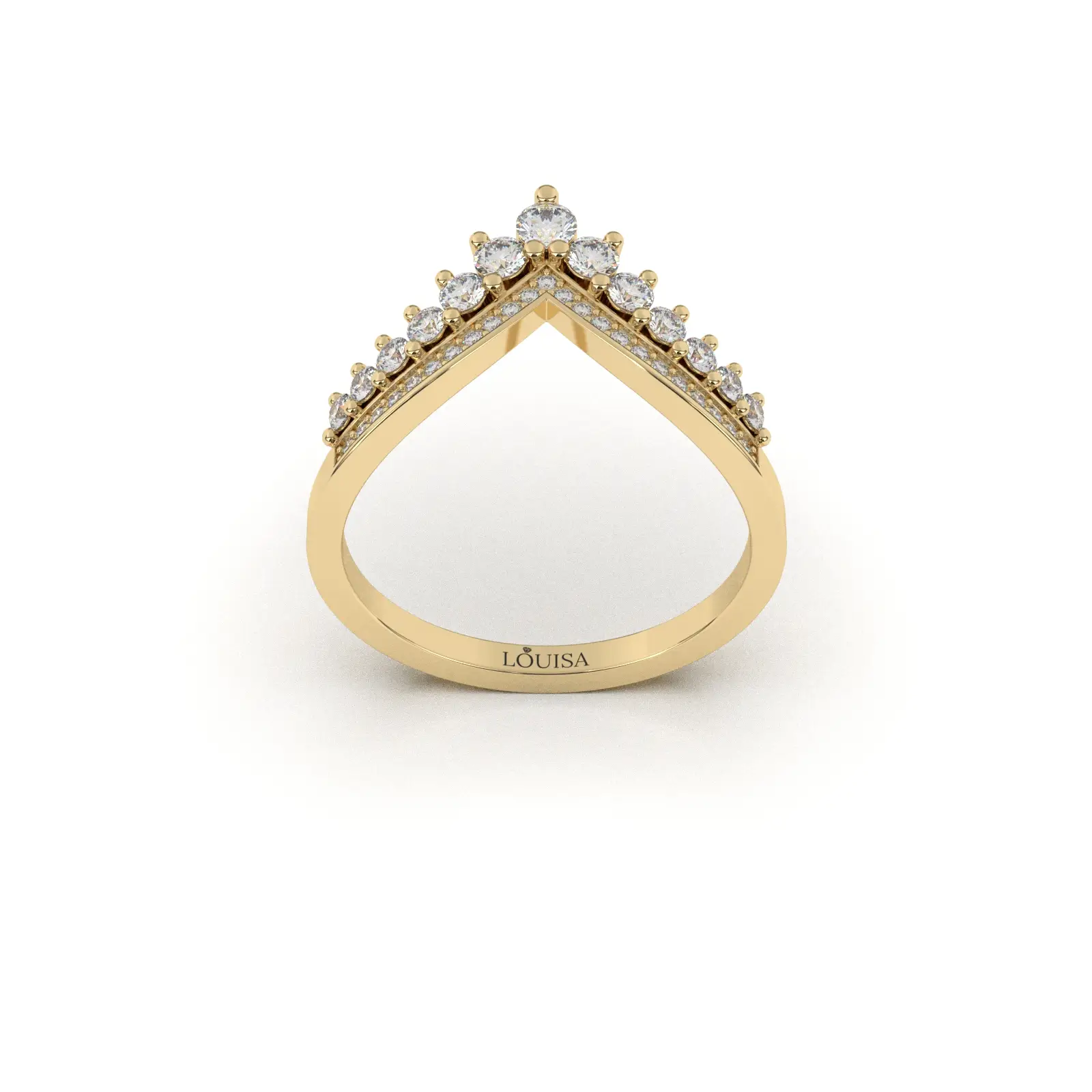 העיצוב כולל שתי שורות של יהלומים עגולים – שורה עליונה בגובה משתנה לקבלת אפקט כתר, ושורה תחתונה בקו אחיד המחזקת את מראה ה-V האלגנטי.