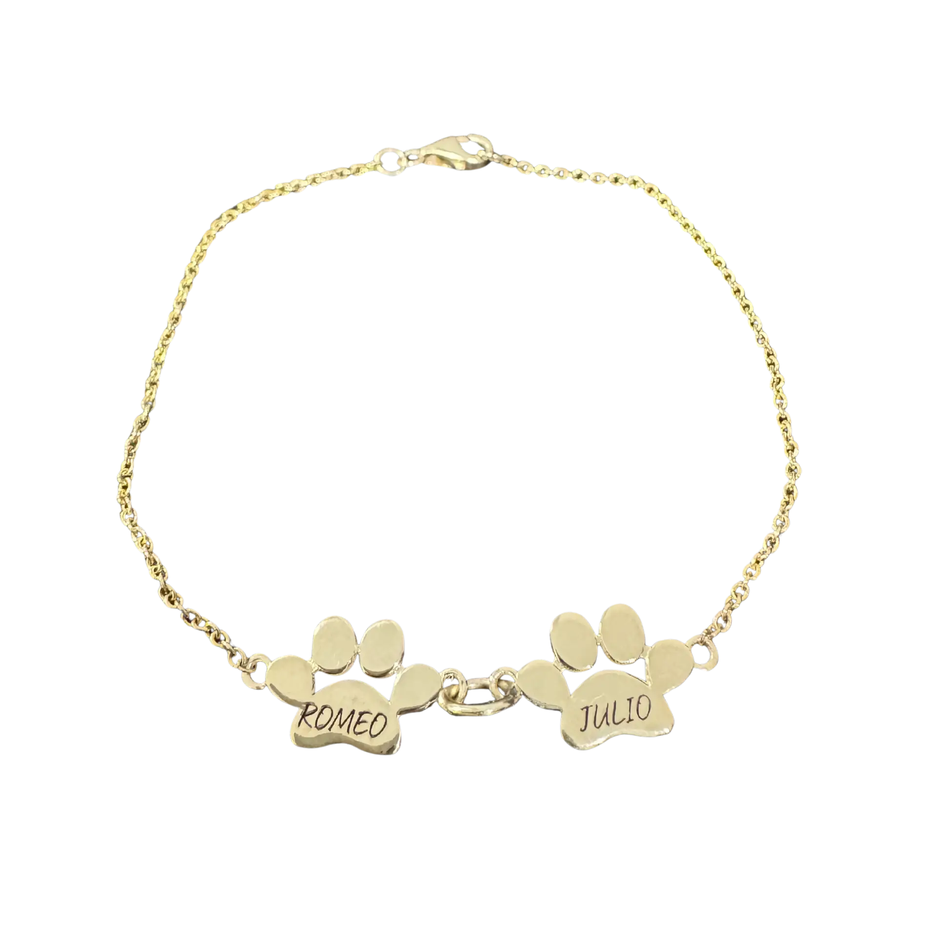 הצמיד מעוצב בסגנון עדין ויוקרתי, המשלב תליוני כפות רגליים המחוברים זה לזה בהרמוניה, כאשר על כל כף רגל נחרוט עבורך את השם של הכלב/ה האהוב/ה שלך.