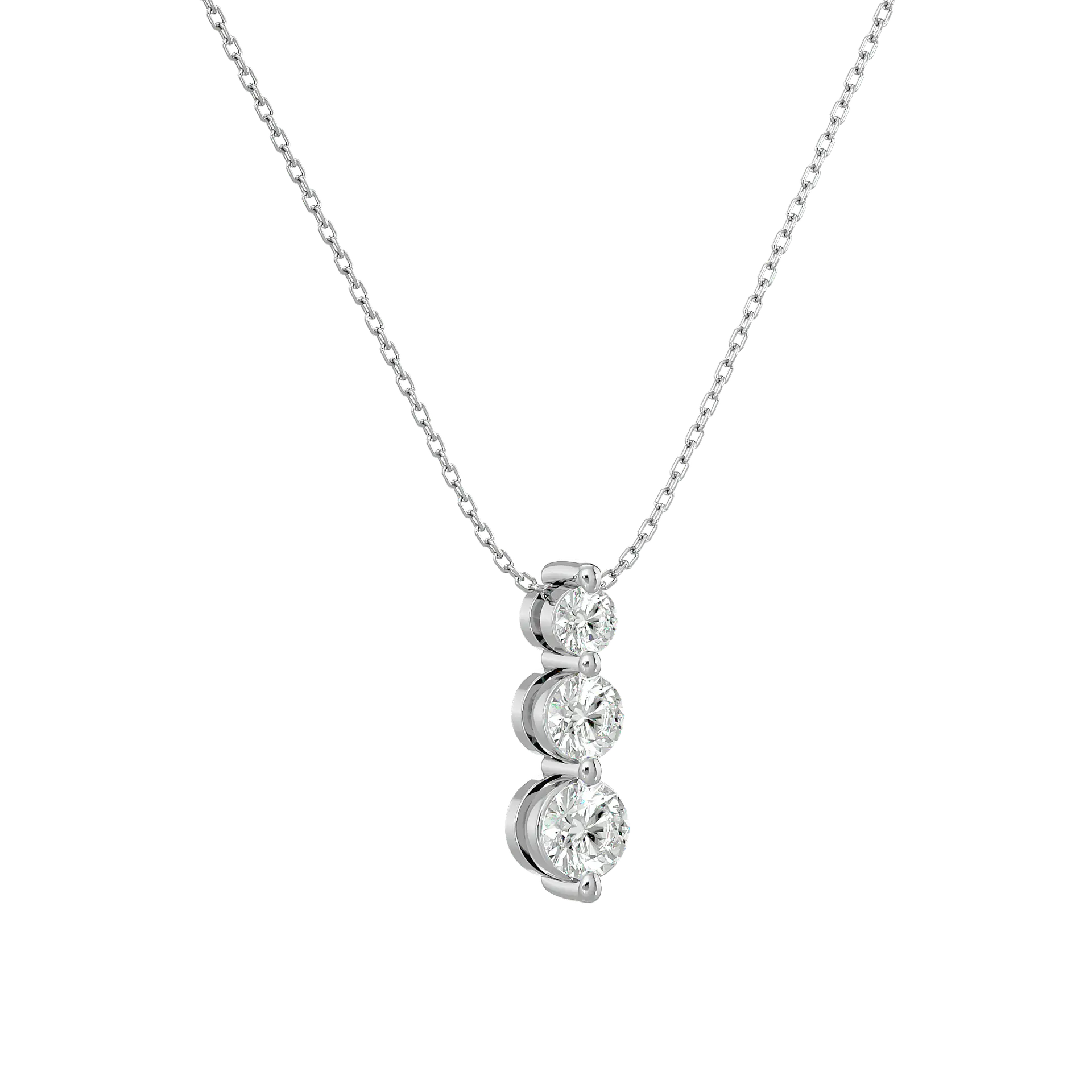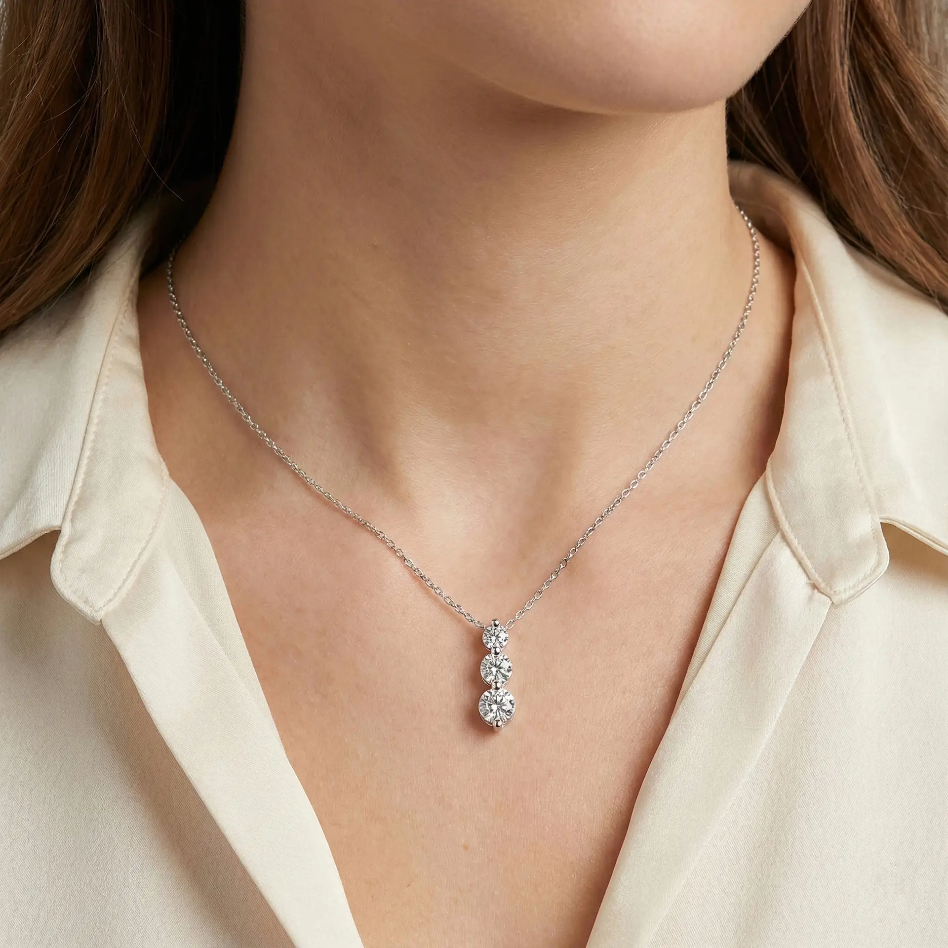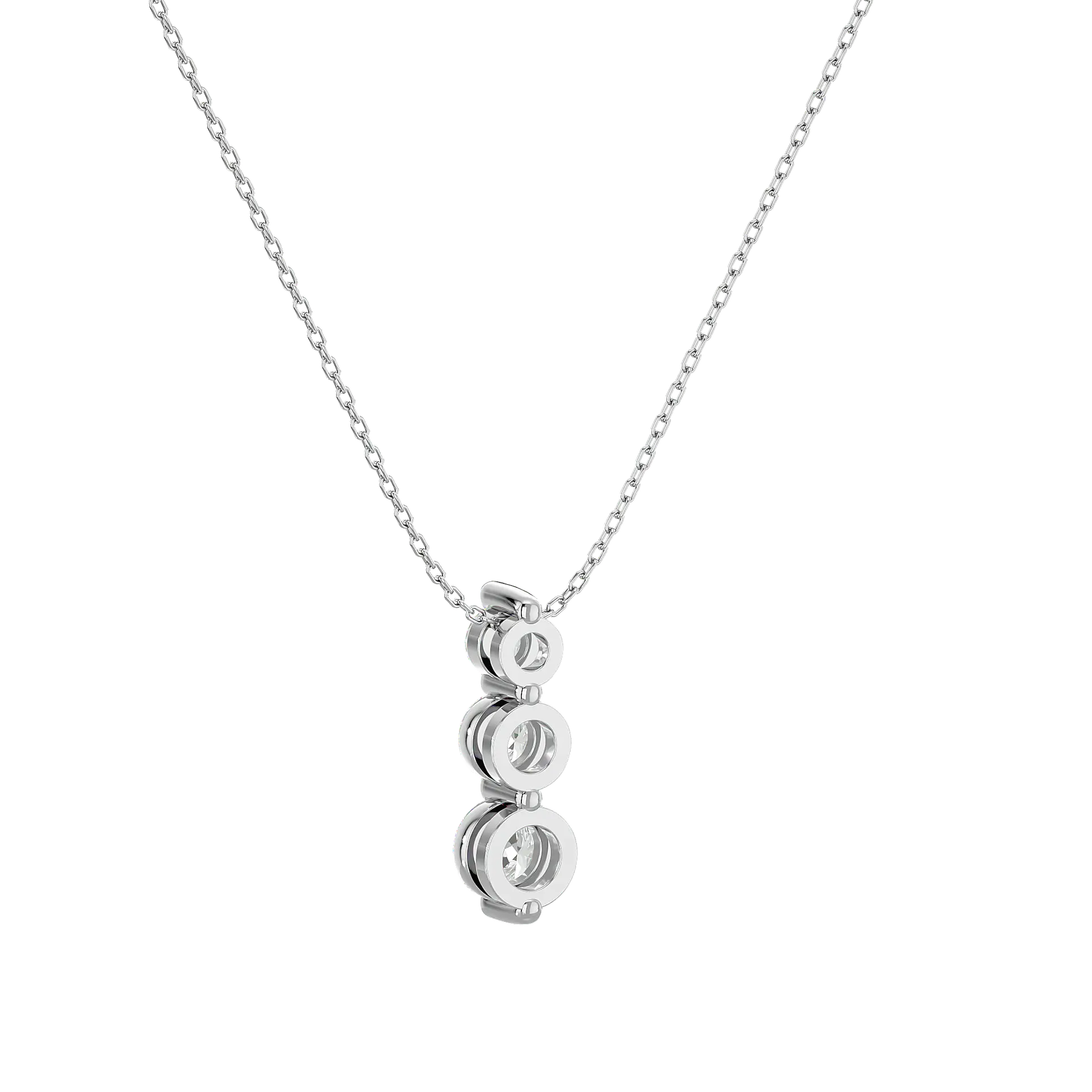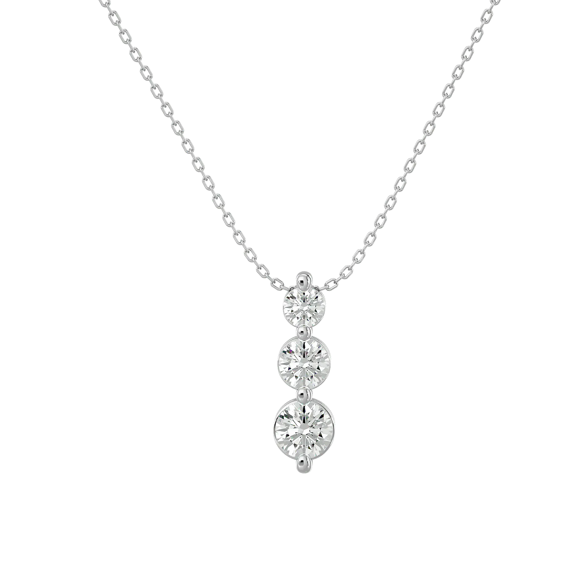 הכירי את שרשרת הטריו שלנו, המציגה שלושה יהלומים עגולים בשיבוץ אנכי מדורג: